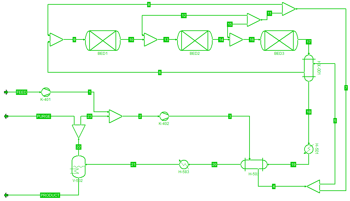 Simulation of ammonia synthesis using a three-bed quench / cold-shot process with inspiration from