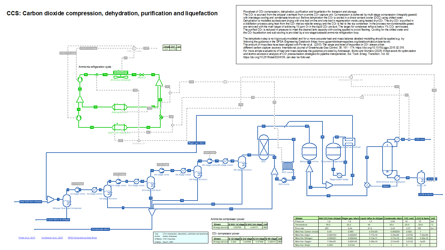 Flowsheet of CO2 compression, dehydration, purification and liquefaction for transport and storage. The CO2 is sourced from the stripper overhead from a amine CO2 capture unit. Compression is achieved by multi-stage compression (integrally geared) with interstage cooling and condensate knock-out. Before dehydration, the CO2 is cooled in a direct contact cooler (DCC) using chilled water. Dehydration is modelled as desiccant drying with one bed on-line and one-bed in regeneration mode using heated dry-CO2. The dry CO2 is purified in a distillation process using heat from the CO2 inlet as reboiler energy and the CO2 is fed to the top condenser. In the process, non-condensable gases are removed with the main target of achieving 10 ppm O2 in the liquid CO2 product. The target for condenser reflux is below 1% CO2 vent losses. The purified CO2 is reduced in pressure to meet the desired tank capacity with cooling applied to avoid flashing. Cooling for the chilled water and the CO2 liquefaction and sub-cooling is provided by a two-stage/cascade ammonia refrigeration loop. The dehydration step is not rigorously modelled and for a more accurate heat and mass balance detailed modelling should be applied e.g. by following the guidance in the GPSA Engineering Databook. The amount of impurities have been aligned with Porter et al., (2015). The range and level of impurities in CO2 streams from different carbon capture sources. See also International Journal of Greenhouse Gas Control, 36. 161 - 174. For more simple evaluations of heat and mass balances the guidance provided by Andreasen, Bonto and Montero (2025), A framework for optimisation and techno-economic analysis of CO2 pressurisation strategies for pipeline transportation, Sci. Tech. Energ. Transition, Vol. 80, can also be followed. Author: Anders Andreasen preview... |