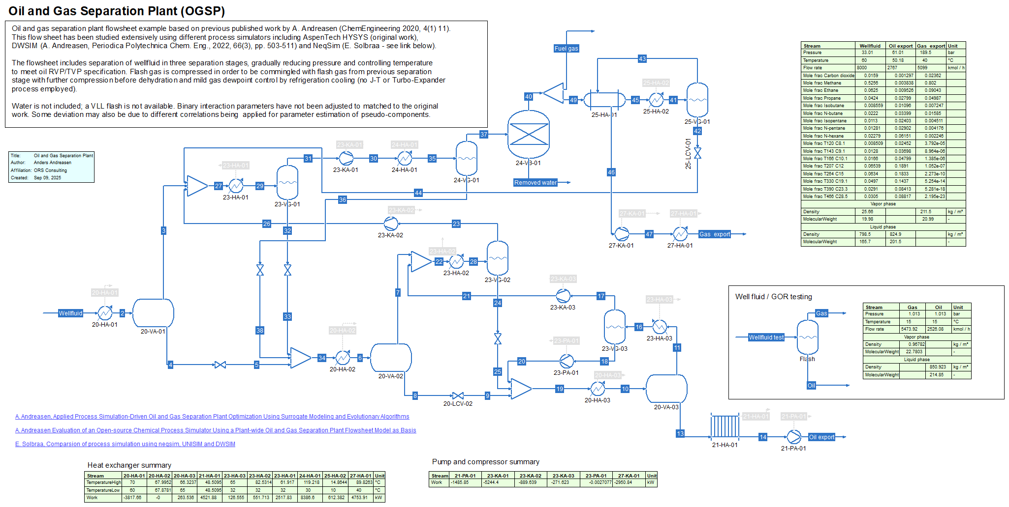 Oil and gas separation plant flowsheet example based on previous published work by A. Andreasen