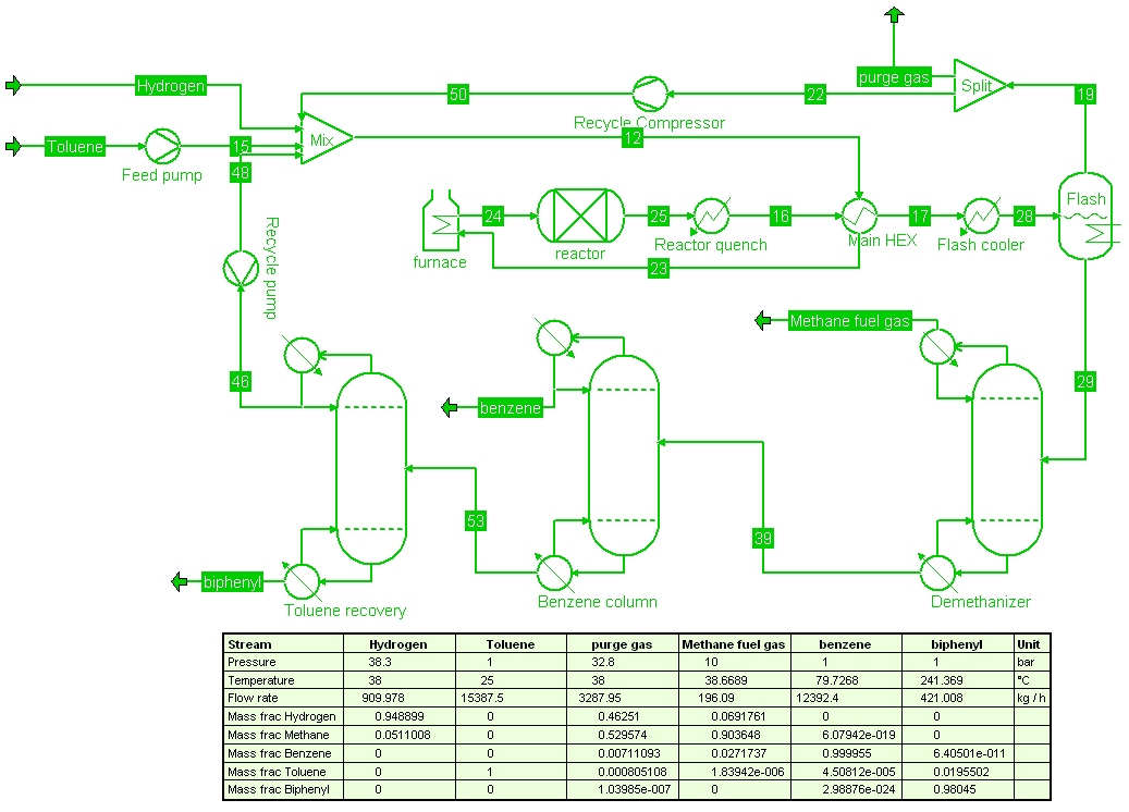 COFE, COUSCOUS, ChemSep, TEA, CORN | This case study is a modified version of the 1967 American Institute of Chemical Engineers student contest problem for the dealkylation of toluene to benzene with hydrogen, see "Conceptual Design of Chemical Processes", McGrawHill,