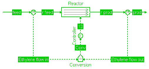 conversion. The example demonstrates use of a reaction package, measuring units, an information calculator and a controller. It also demonstrates the use of embedded reports and reactor profile graphs. Note that conversion is calculated here by measuring ethylene flow into and out of the reactor. This is for demonstration purposes; the reactor can be configured such that it exposes conversion of any compound directly. An alternative version of this flowsheet shows how to control by manipulating a feed flow. preview... |